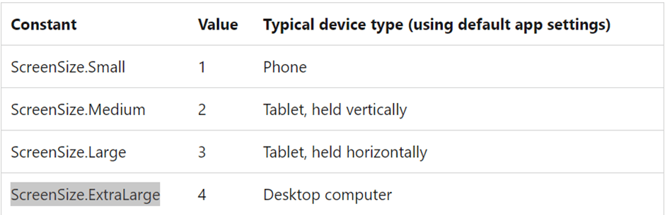 So, if the Parent.Size = SreenSize.ExtraLarge (which is 4), means that the canvas app is opened in desktop browser else it should open another client interface (Phone / Tablet)