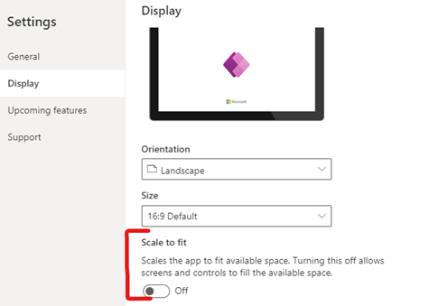 Ensure to turn off Scale to fit property in the settings of Canvas app because it will affect the Screen Size property value and if Scale to fit setting is turned on then the Parent.Size is 4 for both tablet app and browser on desktop hence the above check will not work. Refer to the screenshots below to get a good understanding of the setting.