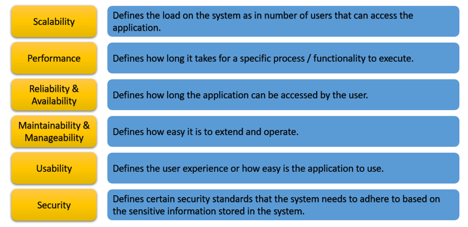 Mainly in any project we start encountering performance issues because of inadequate understanding of the customer expectations with regards to how long a process can take to run. Which is a result of incorrectly / not documenting Non-functional requirements (NFRs). If the NFRs are not documented then we probably miss the train to include those constraints in the development cycle. Non-functional requirements can be categorized as follows –